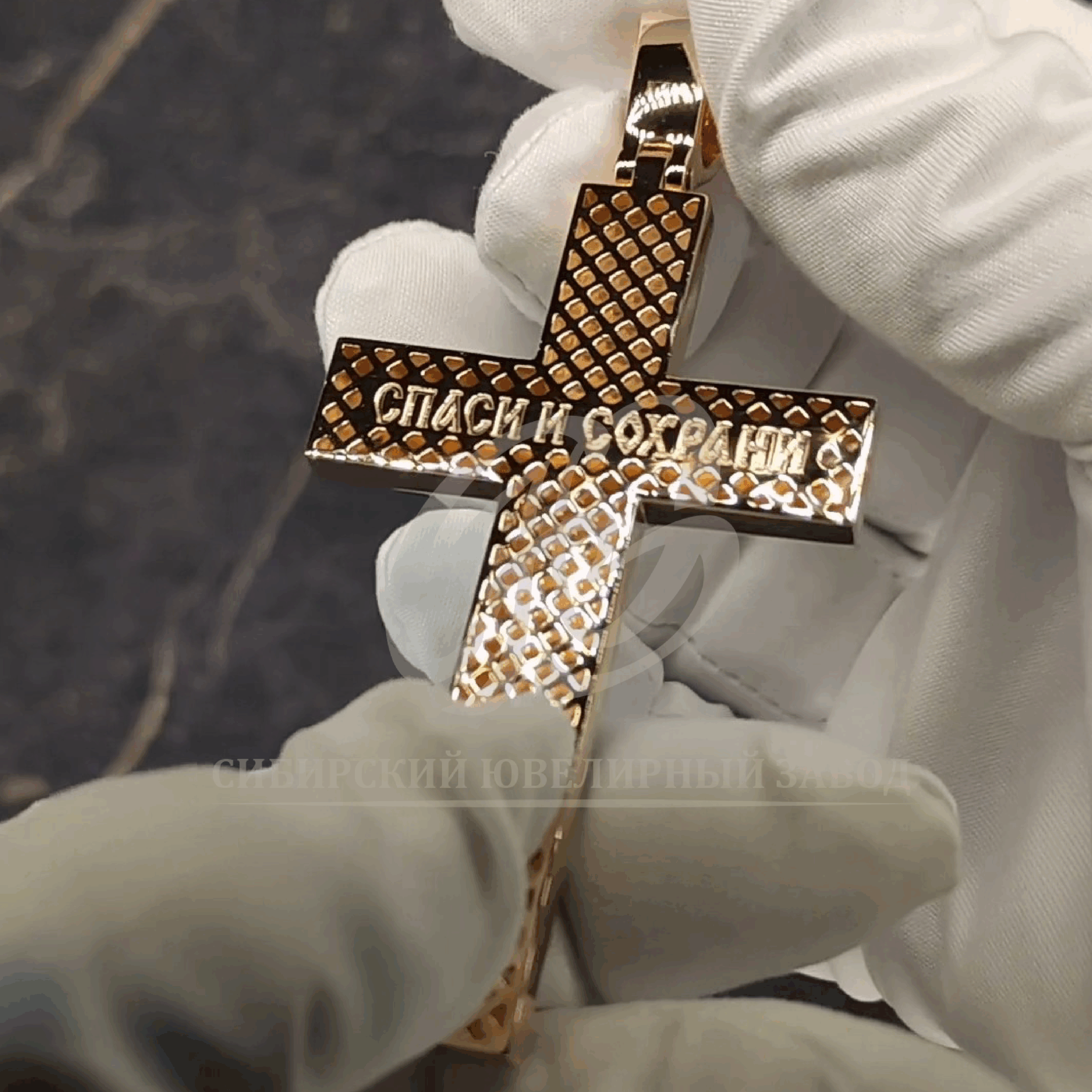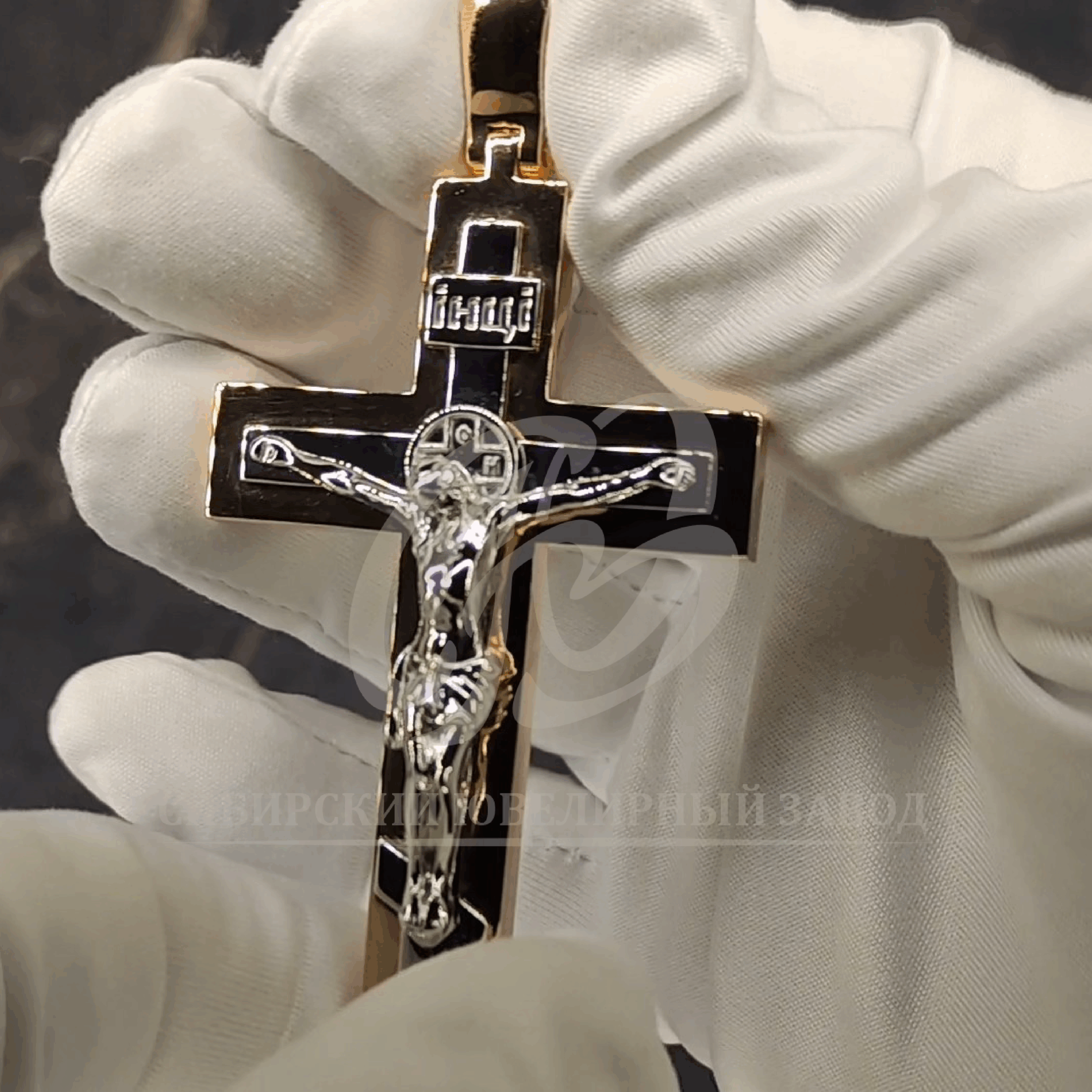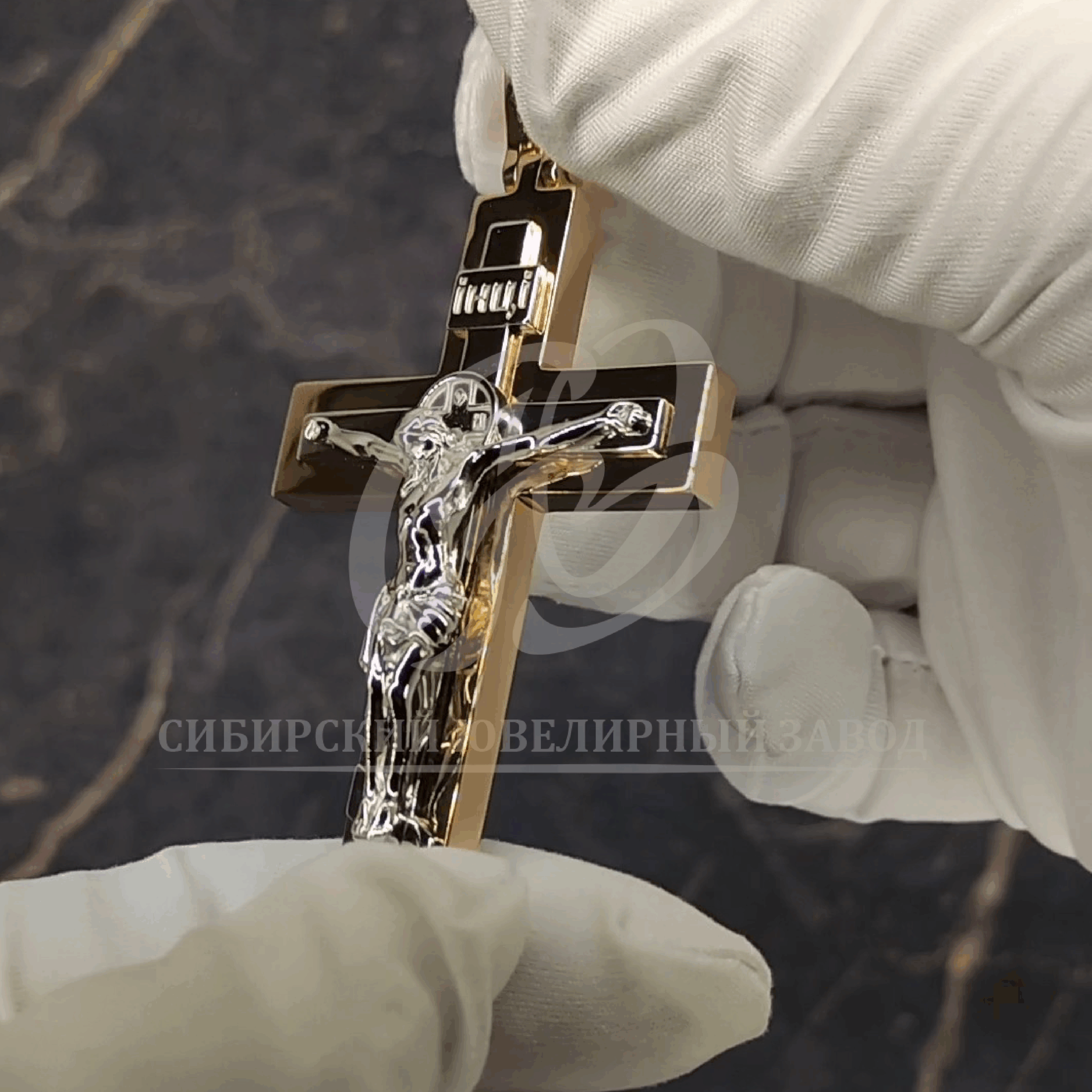 Мужской крест — продуман и проработан в мельчайших деталях. Крест выполнен из традиционного и белого золота 585 пробы. Вес креста — 36,73 гр.